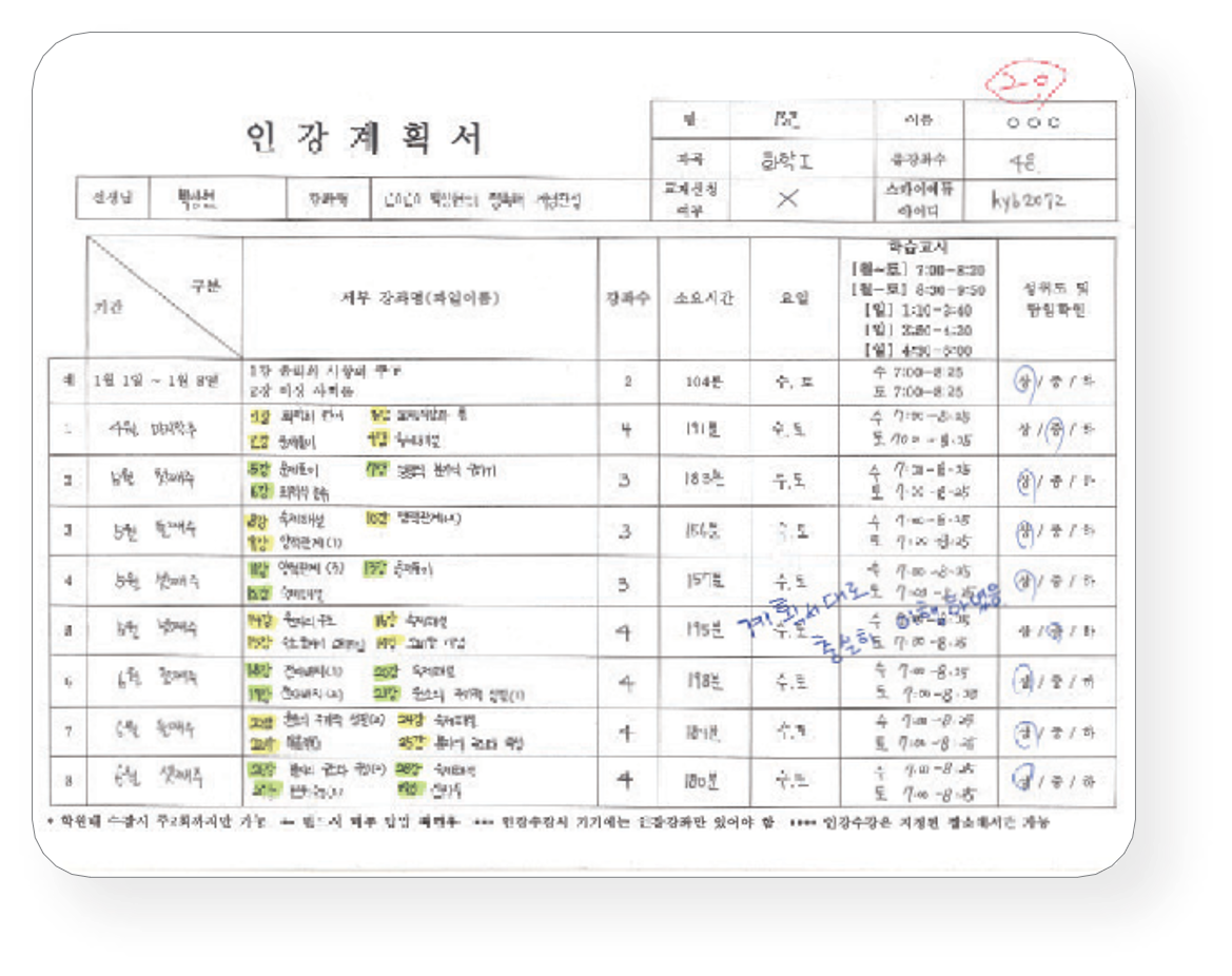 | 조회, 영단어TEST 스터디플래너 작성 | 최소 필수수업 | 수학 일일 TEST | 국· 수·영 선택수업 | 탐구 선택수업 자기주도학습 상담 & 질문응답 |